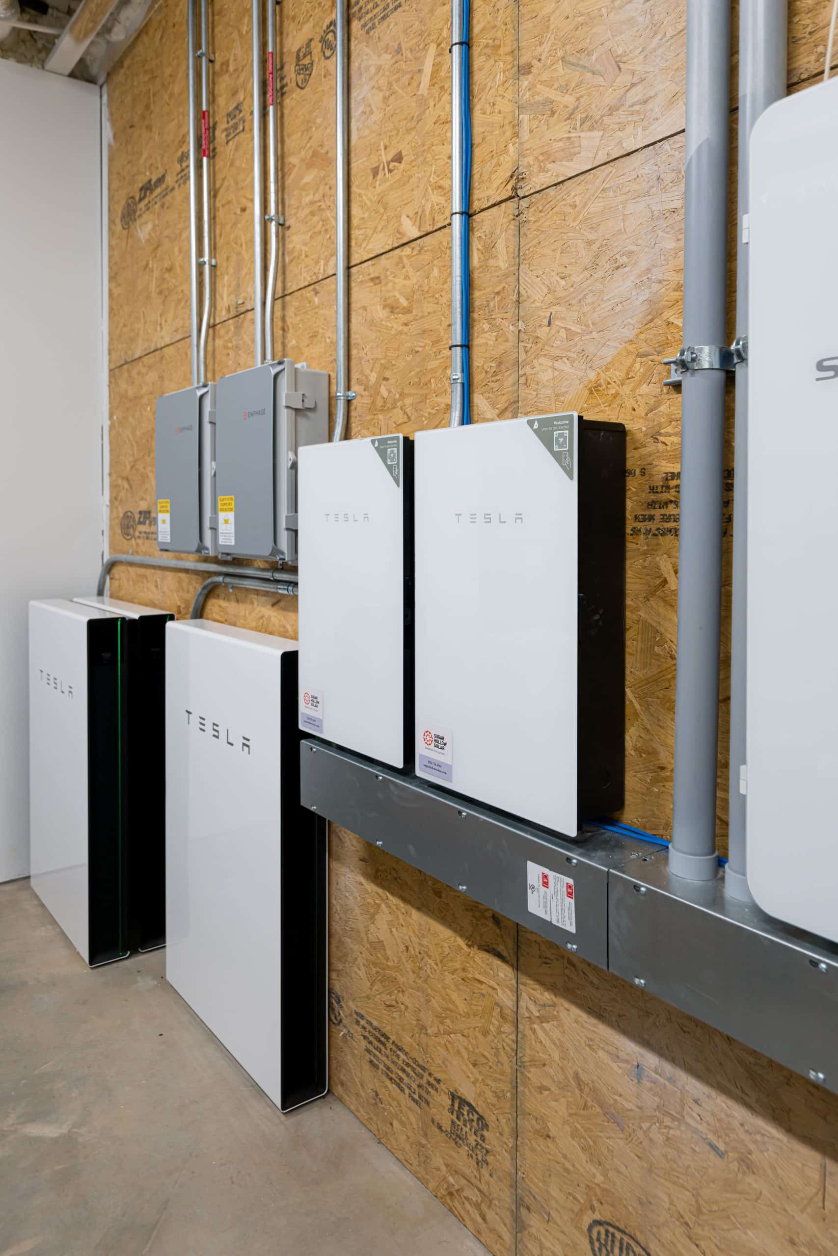 Tesla Powerwalls (40.5 kWh of storage) allow the home to run for extended periods off-grid without sacrificing comfort.
